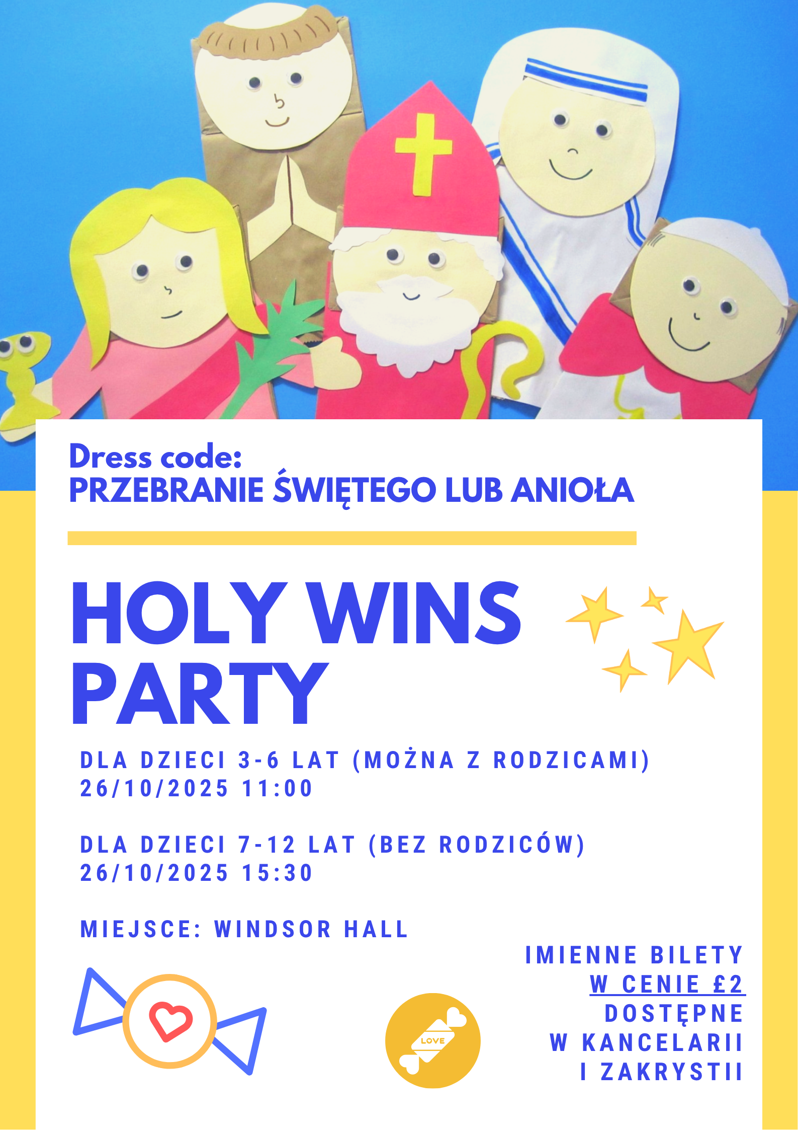 (7) W niedzielę 26 października organizujemy „Bal wszystkich Świętych” dla dzieci. Bal odbędzie się w dwóch turach - dla dzieci młodszych (3-6 lat) po Mszy świętej o 10:00 oraz dla dzieci starszych (7-12 lat) po Mszy o 14:30. Na bal obowiązują imienne wejściówki w cenie dwóch funtów dostępne w zakrystii i kancelarii. Plakat wydarzenia dostępny tutaj.