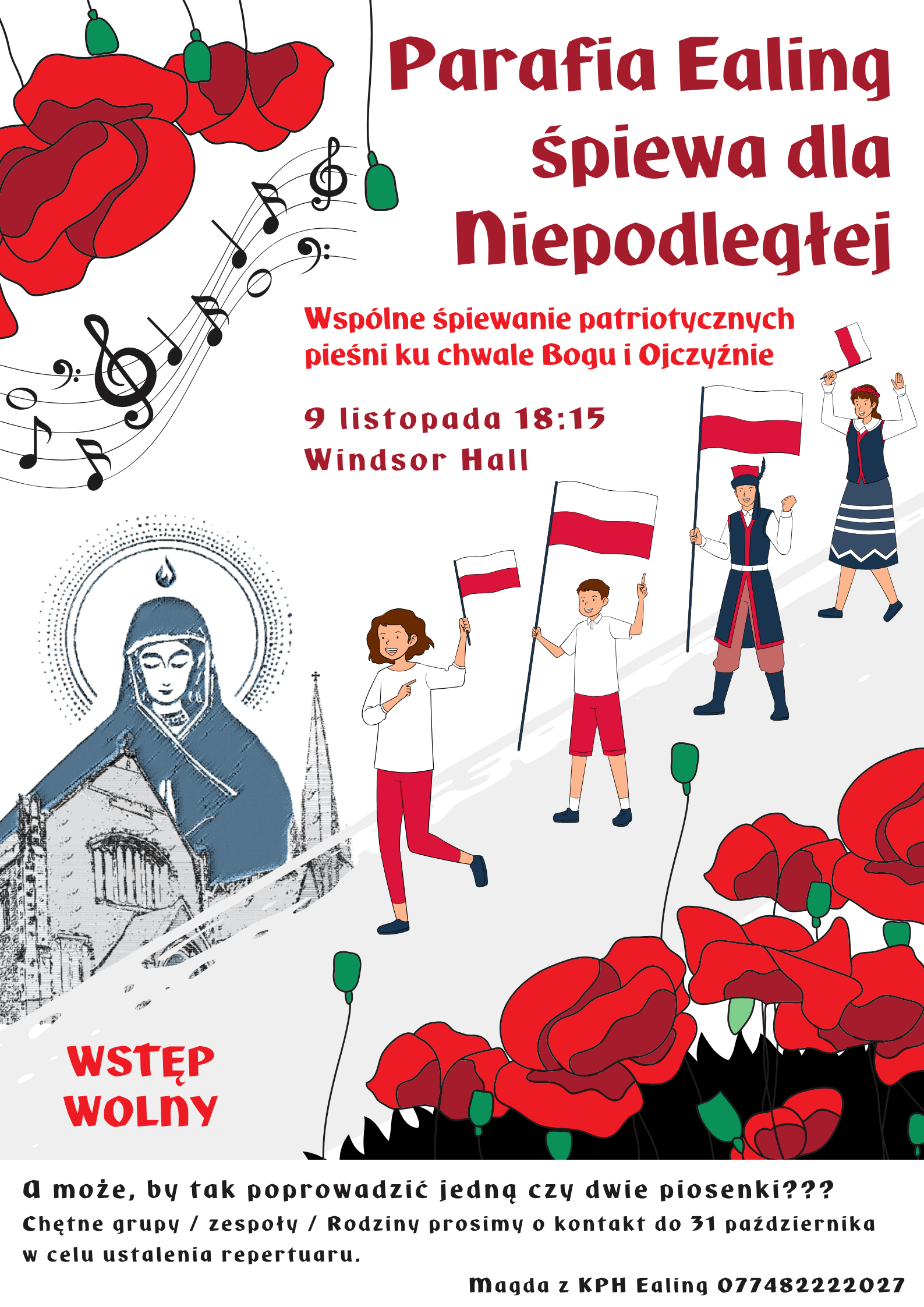 (8) W niedzielę 9 listopada po Mszy świętej o godzinie 17:15 organizujemy koncert pieśni patriotycznych pod hasłem: "Parafia Ealing śpiewa dla Niepodległej". Chcemy ku chwale Boga i Ojczyzny zaśpiewać wspólnie teksty ważne dla niepodległości naszego narodu. Rodziny / grupy parafialne / zespoły, które byłyby chętne do poprowadzenia jednej, dwóch pieśni, proszone są o kontakt z ks. Piotrem lub panią Magdą z Koła Przyjaciół Harcerzy na Ealingu (077482222027). Szczegóły na plakatach i w biuletynie. Plakat wydarzenia dostępny tutaj.
